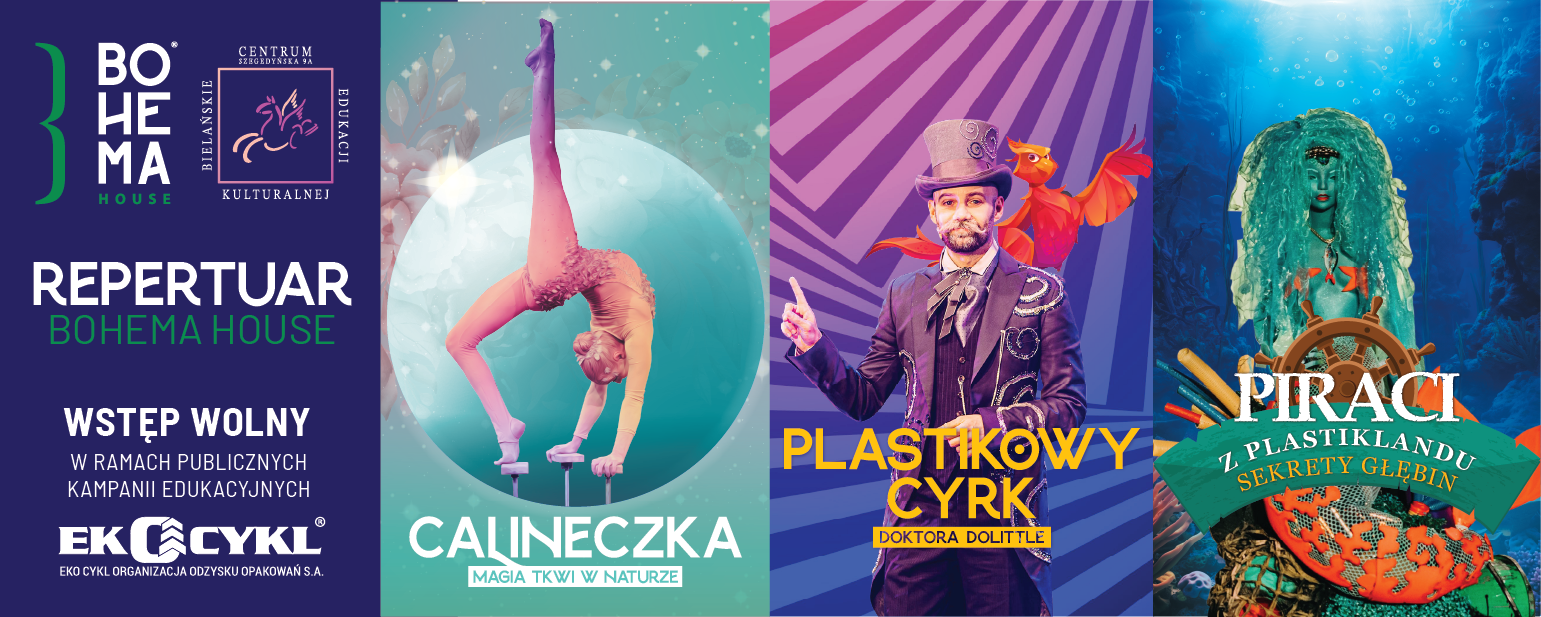 Już 25 i 26 marca spektakle Teatru Ekologicznego Bohema House zagoszczą na nowej scenie stacjonarnej. Gościnnie w Bielańskim Centrum Edukacji Kulturalnej (BCEK) zagramy widowisko “Plastikowy Cyrk Doktora Dolittle”. Rozrywka i edukacja Spektakl “Plastikowy Cyrk Doktora Dolittle” to widowisko familijne. Jeden z najbarwniejszych spektakli Teatru Ekologicznego Bohema House. Opowiada o zanieczyszczeniu środowiska plastikiem i ratowaniu zwierząt […]